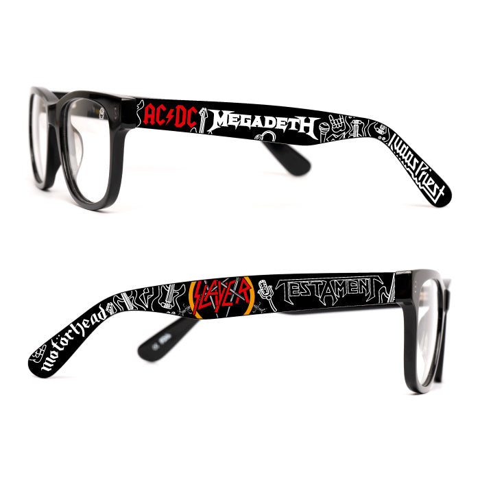 Hechas para headbangers de corazón, estas monturas de acetato premium reúnen a AC/DC, Megadeth, Judas Priest, Motörhead, Slayer y Testament en laterales ilustrados con logos, cuernos metal y guiños de escenario. Riffs rápidos, actitud de mosh y comodidad para el día a día.