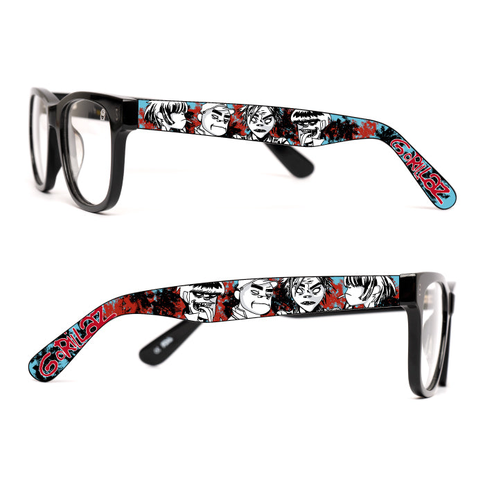 2-D, Murdoc, Noodle y Russel en viñetas blancas sobre salpicaduras cian/rojo; laterales personalizados en una montura de acetato italiano premium, cómoda y compatible con todo tipo de lentes; con filtros UV y antirreflejo reduces brillo y fatiga visual para uso 24/7. Feel Good Inc. para tus ojos.