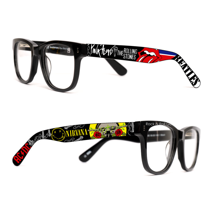 Para quien lleva el rock en la memoria y en la ropa, estas monturas de acetato premium combinan negro profundo con laterales ilustrados: prisma Pink Floyd, lengua de los Rolling, guiño Beatles, smiley Nirvana, roses & guns y rayo AC/DC. Estilo de vinilo, actitud de estadio.