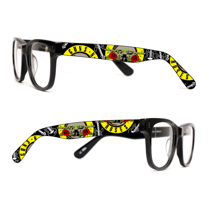 Escudo amarillo con pistolas y rosas —el emblema GNR— en laterales personalizados sobre gafas de acetato italiano premium, cómodas y compatibles con todo tipo de lentes; con filtros UV y antirreflejo reduces deslumbramiento y fatiga visual. Sweet child o’ eyes.