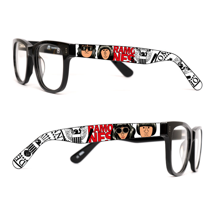 Hey Ho, Let’s Go: retratos cartoon y sello águila en blanco y negro; laterales personalizados que gritan CBGB y punk eterno sobre una montura de acetato italiano premium, cómoda y compatible con todo tipo de lentes; con filtros UV y antirreflejo reduces deslumbramiento y fatiga visual. 1-2-3-4 — ¡agrégalas al carrito!