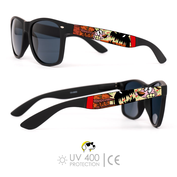 Cuando todo da miedo, tú ves con más valentía. Estas gafas de sol UV400 capturan la esencia de Courage the Cowardly Dog, ese perro asustadizo con el corazón más grande. Con escenas estilizadas del campo de Nowhere y sombras aterradoras, este diseño es para quienes enfrentan sus miedos con estilo.